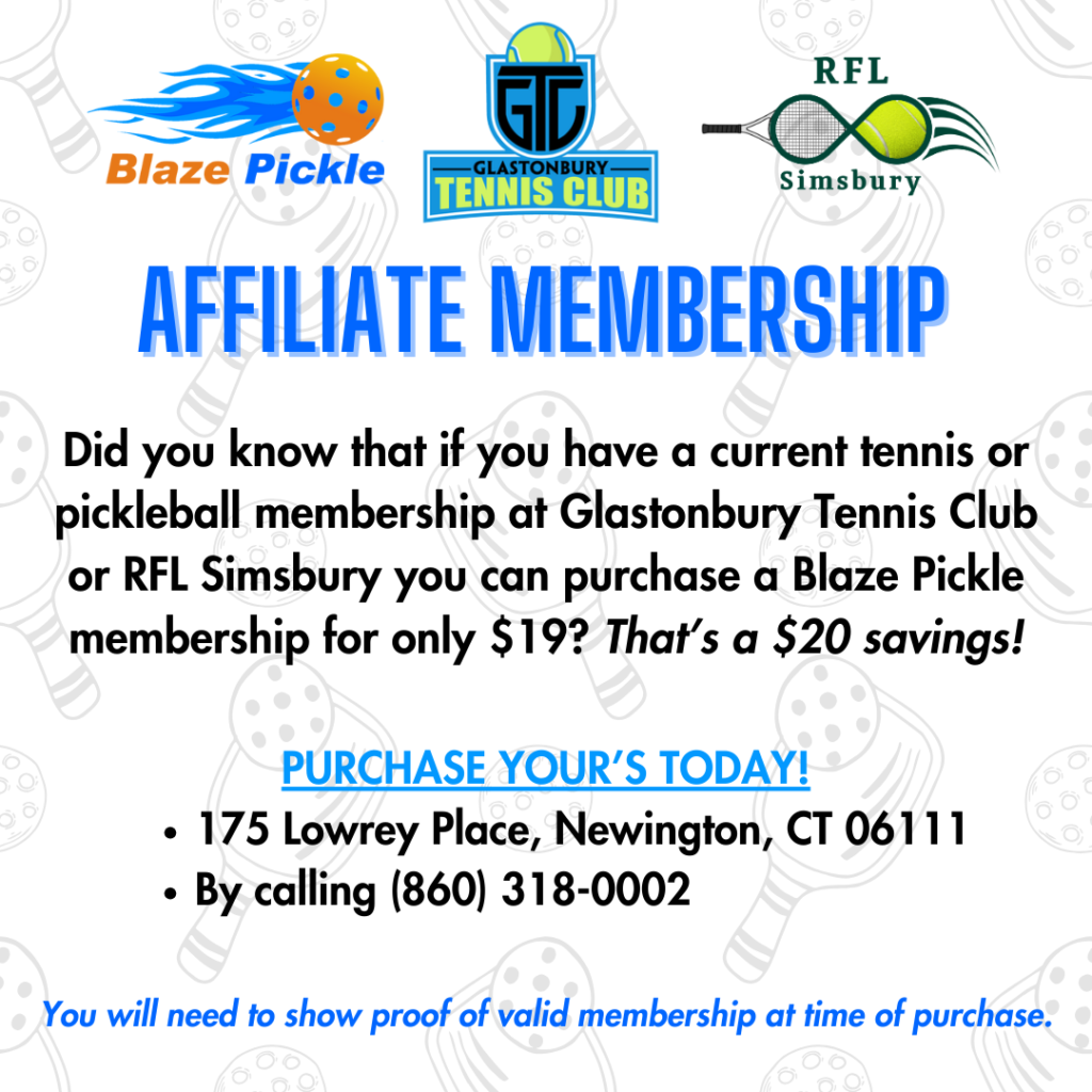 And if you’re a Glastonbury Tennis Club or Racquets for Life Simsbury member, you can become a Blaze member for ONLY $19!