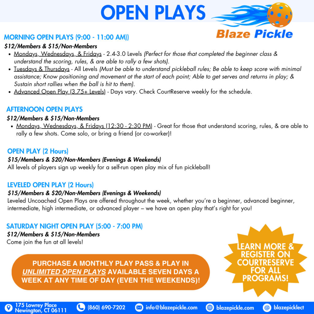 Purchase a Monthly Play Pass & play in unlimited open plays available seven days a week at any time of day (even the weekends)!